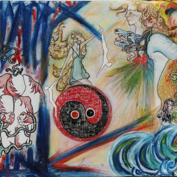 Le opere tracciano le tappe reali ed organiche di un culmine; un lungo processo psico-fisico e spirituale (una profonda iniziatica chiamata) nel 1998 e, che nell’anno 2002 mi portò alla soglia della morte fisica. Nessun elemento è casuale o simbolicamente usato per necessità estetiche o artistiche. In alcune tele i disegni sono uniti da un unico tratto mai spezzato che intreccia e congiunge le trame come una tela di ragno. Nelle opere vi sono presenti dei simboli universali, ma che nondimeno sono affiorati solo con il Risveglio, in quanto prima non ne ero affatto a conoscenza. Per questo motivo confermo che vi è sepolto all’interno di ogni essere un patrimonio comune, oltre al proprio personale e sovra-personale che trasmigra con il suo bagaglio ricco di informazioni. La creatività rientra fra i fenomeni più dolci, che affiorano già ad un primo stimolo del sonnecchiante serbatoio (oltre a quelli extra-ordinari più impegnativi).Potenziale creativo connesso già alla propria natura o personale riserva Ignea. Per quanto riguarda la mia esperienza fu proprio durante l’irruzione spontanea della kundaliny (serbatoio energia-atomica) che iniziai a disegnare e dipingere spontaneamente (più precisamente per avermi già vista fare le stesse cose su di un altro piano temporale) .Mi capita spesso di uscire dal corpo ed assistere ad eventi che si rivelano… in questo caso futuri. Iniziai quindi in un modo del tutto naturale come se lo avessi sempre fatto, Naturale ma non casuale. Trasferivo estaticamente e senza tempo trame ed enigmi sulle tele bianche, intrecciando in una sorta di mappa ad incastro i miei salti temporali fra mondi paralleli, messaggi visionari, il quotidiano intriso di vita.. ed altro Oltre me. Usavo la matita e l’accanita magnificenza esplosiva nell’uso del colore come unico deterrente alla sofferenza (fisica), originata dal Risveglio di un Io multidimensionale stanco di non essere ascoltato. La pittura (anche se non razionalmente) si rivela-va molto efficace e, non solo per entrare in uno stato di assoluta quiete, ma (constatando negli anni) illustra-va alcuni eventi a venire. Quindi incredibilmente trasmette-va anche informazioni, mentre viaggiava parallelamente affiliata ad una nuova coscienza ed all’espulsione di “residui” non più necessari per la mia crescita. Ma anche la nascita ed il trionfo illuminante dei colori di un’auto-trasformazione, sostenuta dalla consapevolezza e dalla volontà ma, soprattutto dalla forza reale creativa : la Fede o il nostro dialogo con l'Infinito. Riconnettersi con la Fonte è l’arte che prediligo, ed ogni co-creatività con altri Esseri e Mondi, è benvenuta per stimolare ed aumentare le frequenze vibrazionali di un sistema matrice in continua creativa evoluzione.